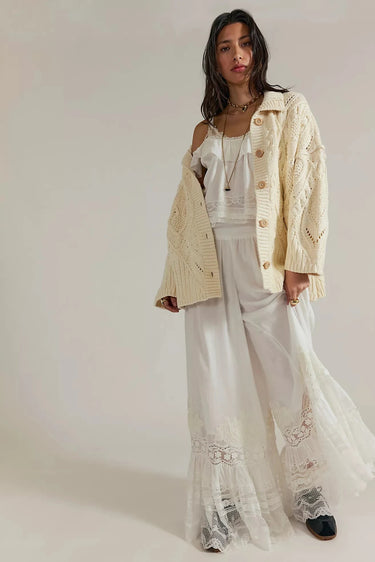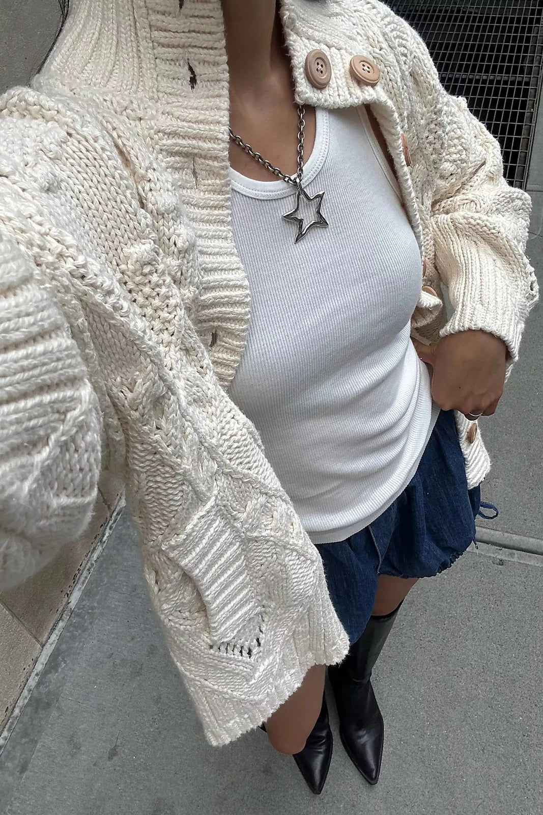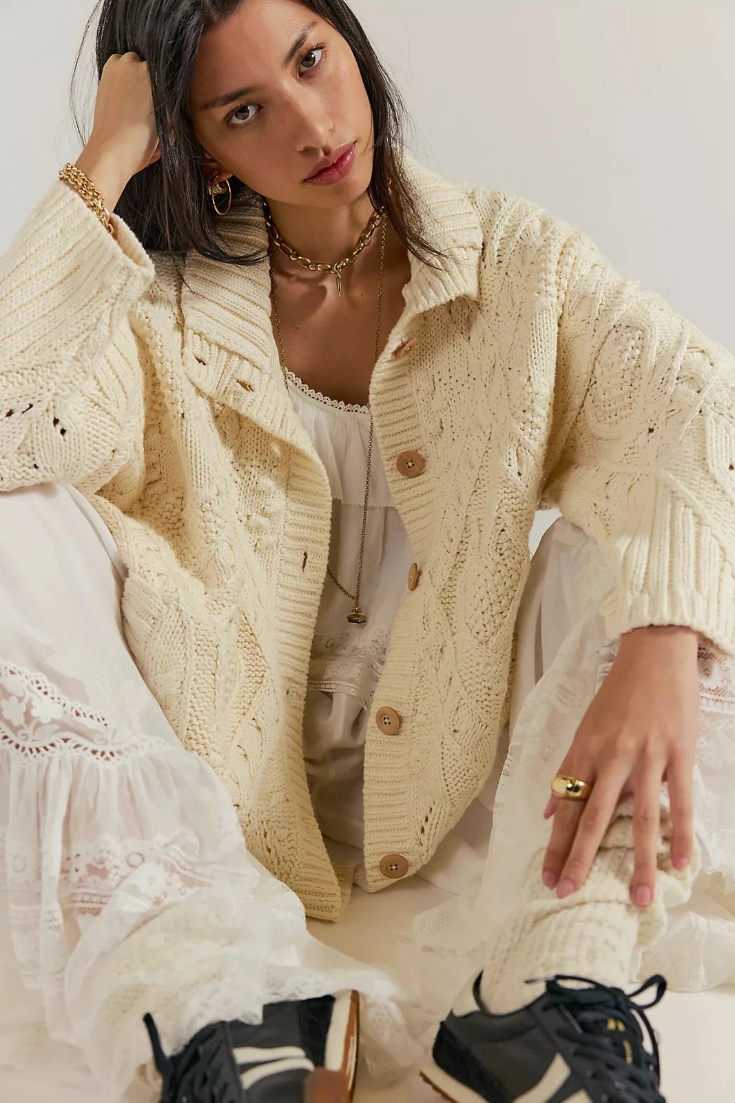 So cozy for year-round wear, this chunky knit cardigan is featured in the perfect oversized design with a collared neckline, cable details, and buttons down the front.