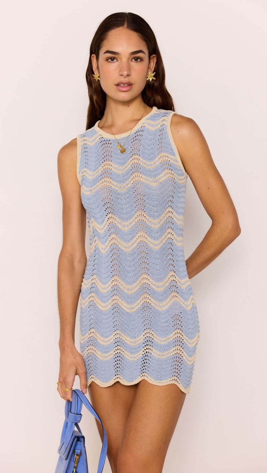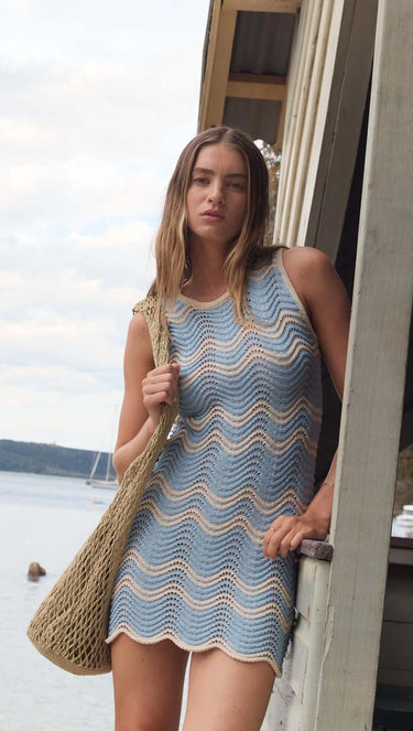 Retro-inspired and effortlessly cool, the Solange Blue & Cream Knit Mini Dress is a summer standout. Featuring a soft blue and cream wave knit pattern, this sleeveless mini is designed in a lightweight open knit with a flattering body-skimming fit and scalloped hem. The perfect mix of playful and polished, it’s your go-to for sun-drenched days or balmy nights. Wear it over swimwear for a beachside look, or style with strappy sandals and accessories for a laidback night out.