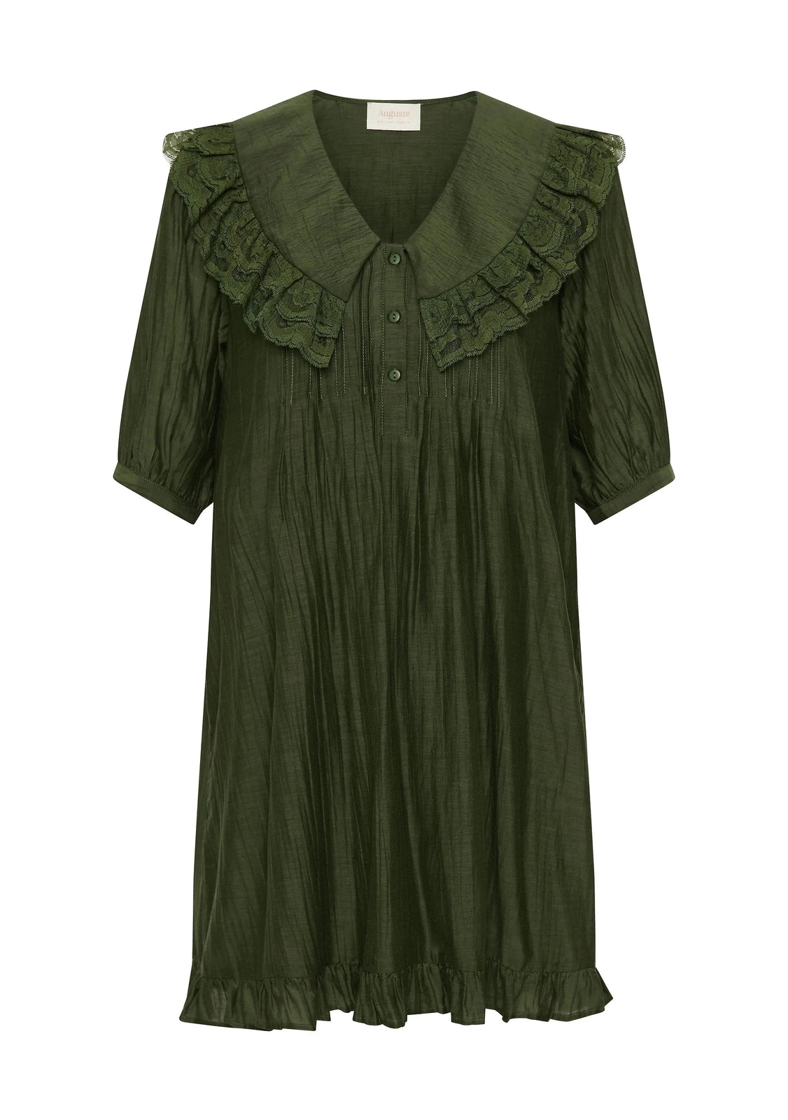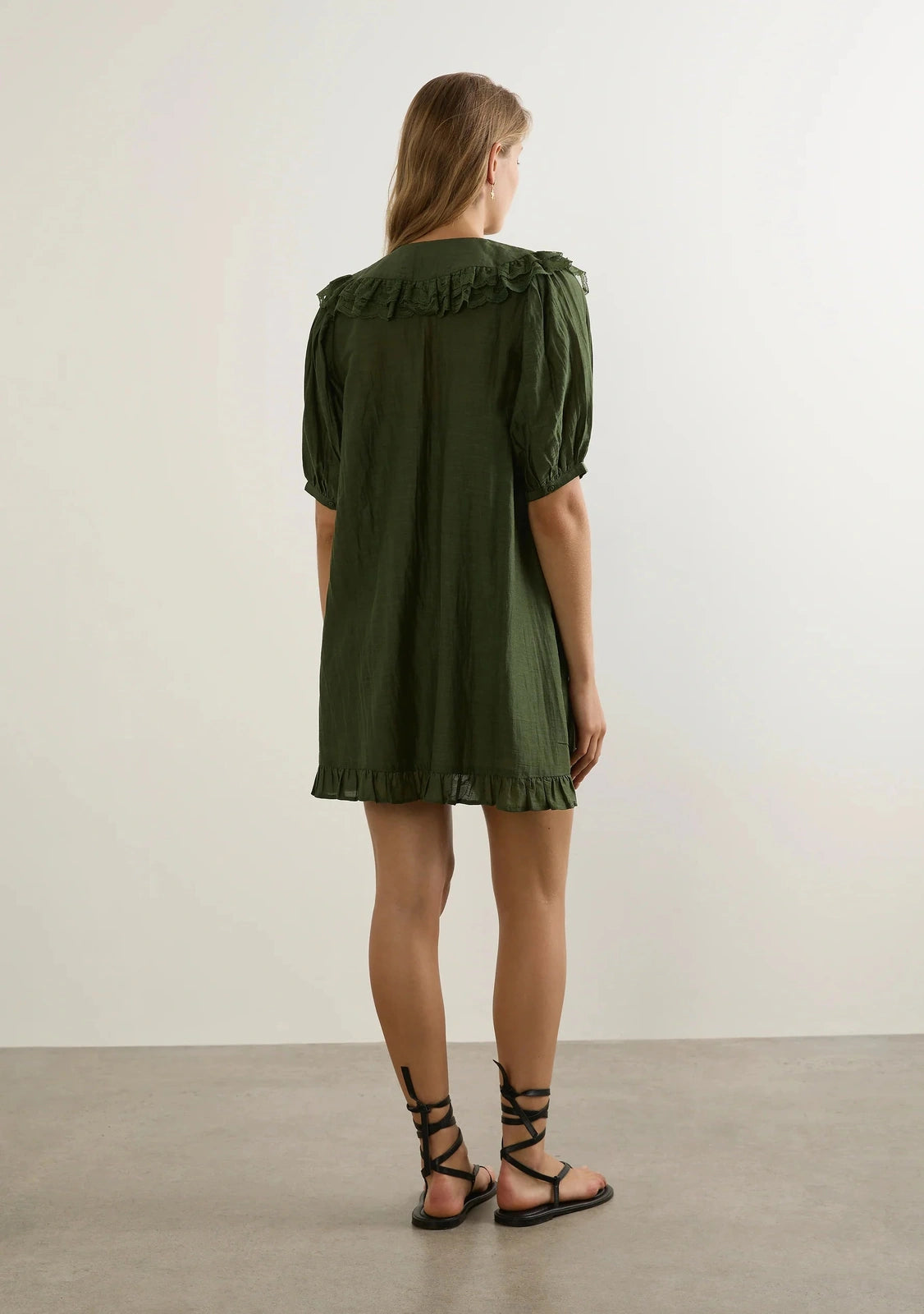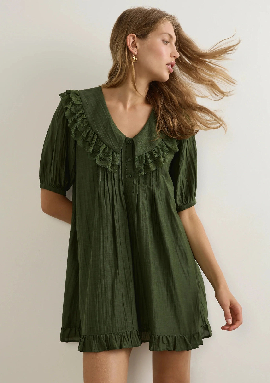 The Otis Mini Dress in deep sage green spares no detail — crafted from a luxurious cotton-silk blend, it features a softly gathered silhouette that’s an everyday essential with a little more. Designed with a lace-trimmed ruffle collar, a button-front closure, puff sleeves with fixed button cuffs, and delicate pintucks throughout, it’s effortlessly feminine and chic.