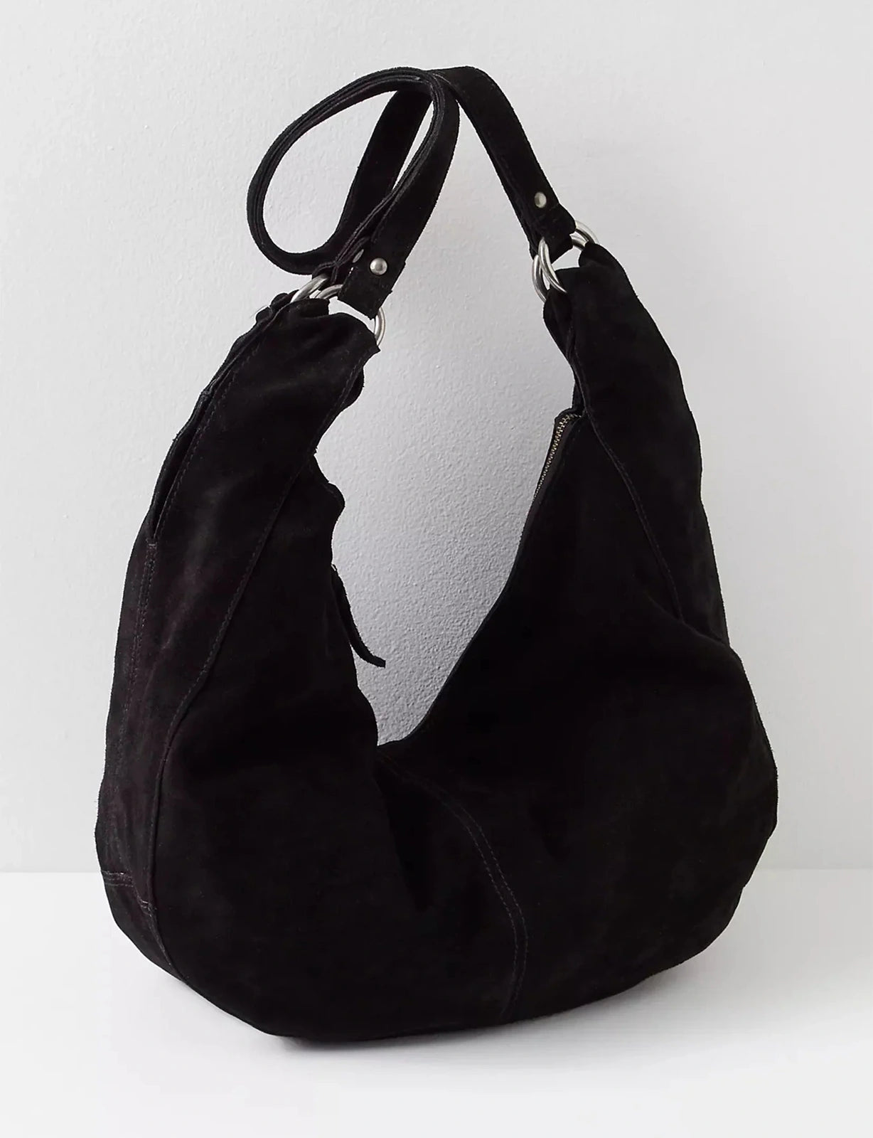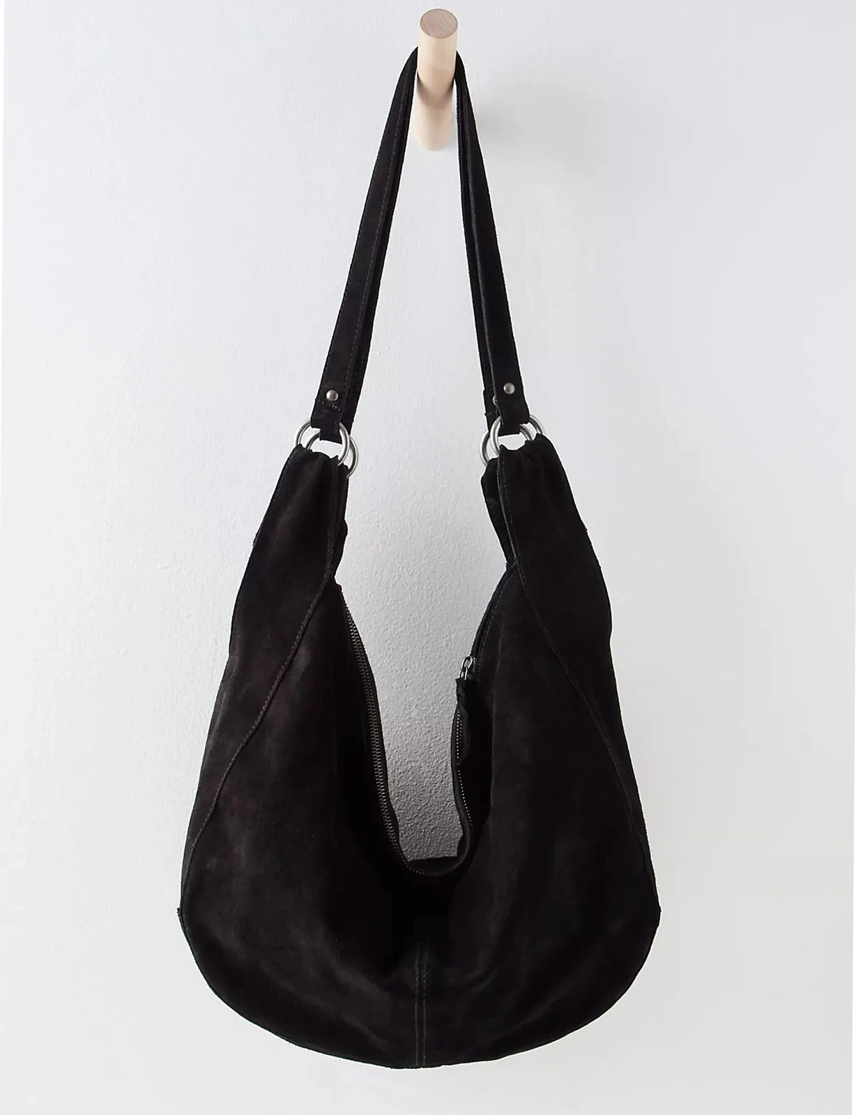 Effortlessly functional, this tote bag is featured in a slouchy hobo style with two elongated shoulder straps, all in soft suede fabrication with zipper closure for the perfect go-to bag.