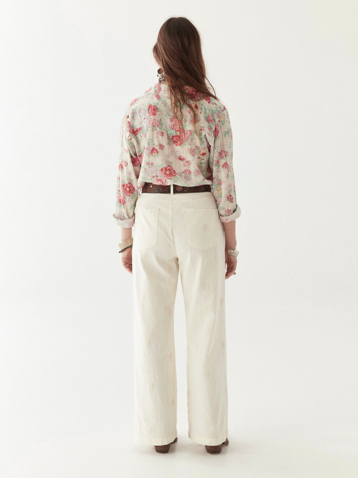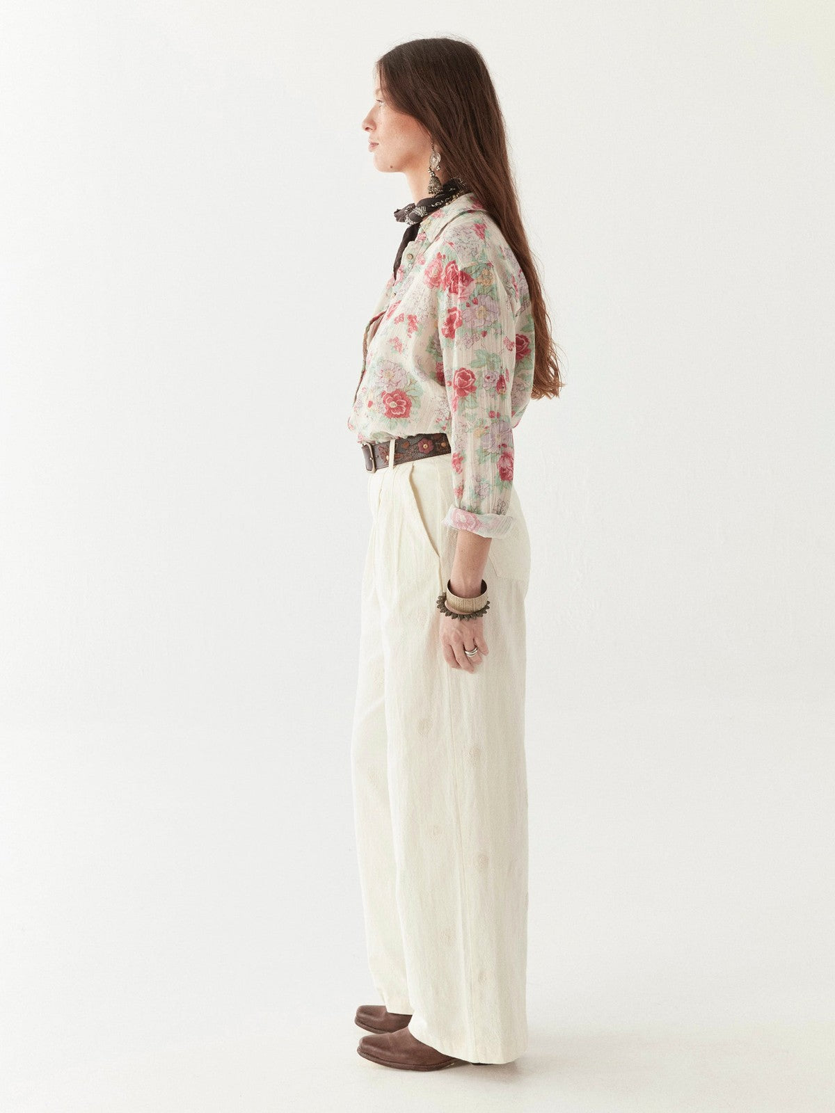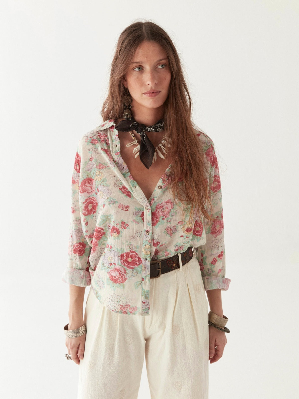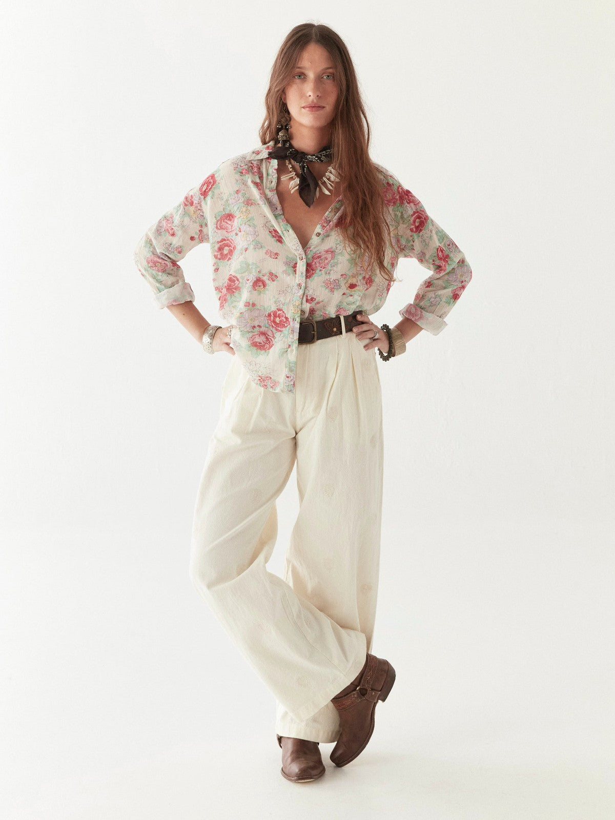 The Georgia Blouse does not bother with subtlety. Crafted from soft cotton, its boxy, fluid fit moves as you do— uncomplicated, with a quiet authority. The candy-rose print is bold, unrestrained, and impossible to ignore. The ruffled sleeves? A deliberate twist that keeps it from being just another blouse.