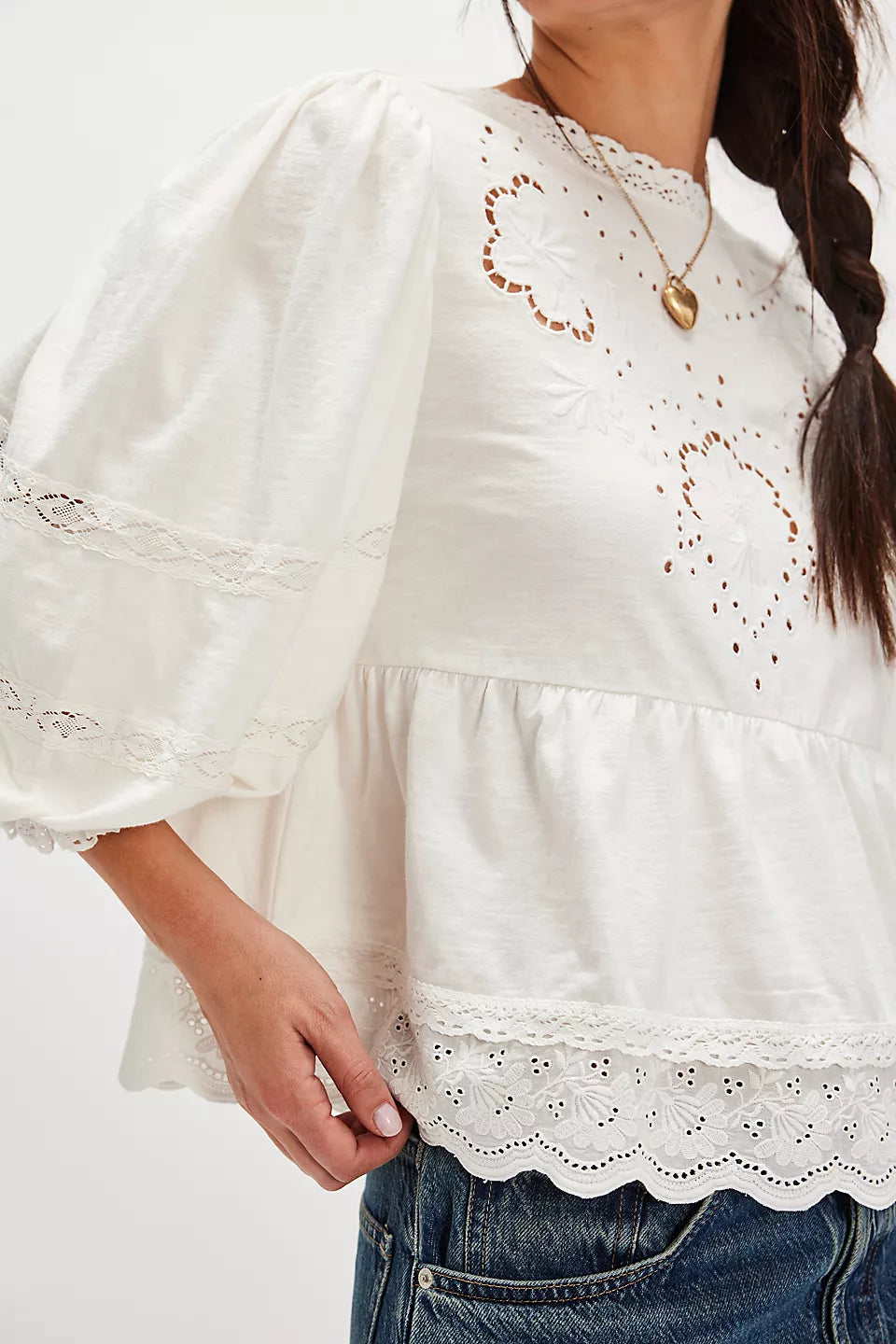 So sweet with endless ways to wear, this two-sided blouse is featured in a crisp cotton poplin with laser-cut details, puffed sleeves, and eyelet and lace trims.